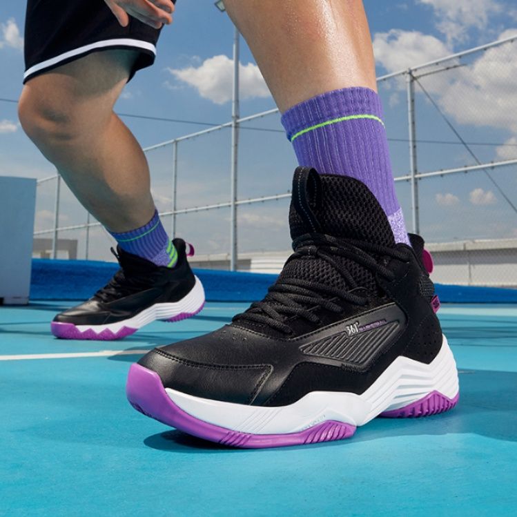 ブラックとパープルの配色が個性的で、足元に強い印象を残します。