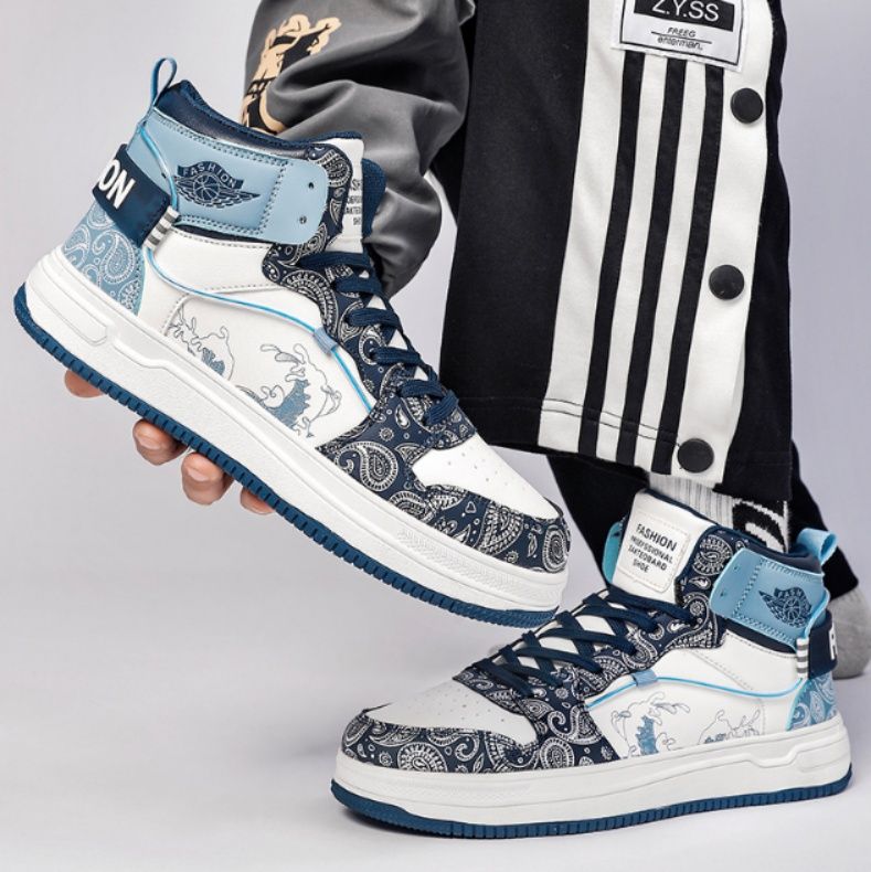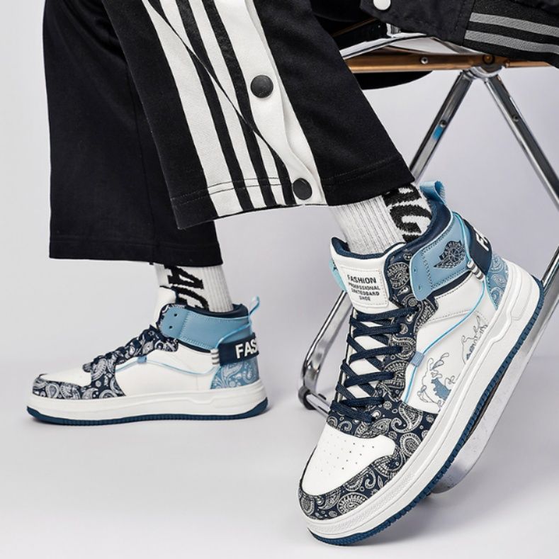 クリーンなホワイトをベースに、ネイビーのペイズリー柄を随所に配した、装飾性の高いハイカットスニーカーです。サイドには波打つようなグラフィックプリントが施され、アンクル部分のスカイブルーのパーツが爽やかなアクセントを添えています。ヒール部分に配された「FASHION」のロゴストラップが、全体のデザインをストリートモードへと昇華させています。
