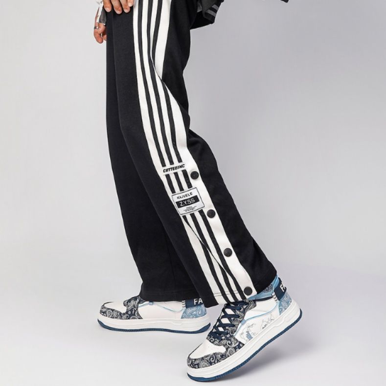 スポーツ・ラグジュアリー: サイドボタン付きのワイドトラックパンツと合わせ、シューズのボリューム感と柄を際立たせるスタイル。